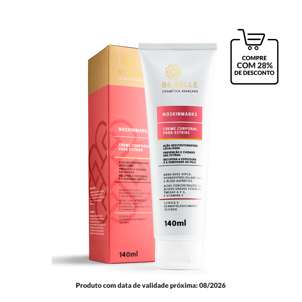 O Creme para estrias, NoSkinMarks® contém nanopartículas do óleo de rosa mosqueta encapsulado, promovendo a prevenção e o cuidado nas estrias, recuperando a espessura e a densidade da pele. Diminui o tamanho, melhora a textura e a coloração das cicatrizes e estrias.